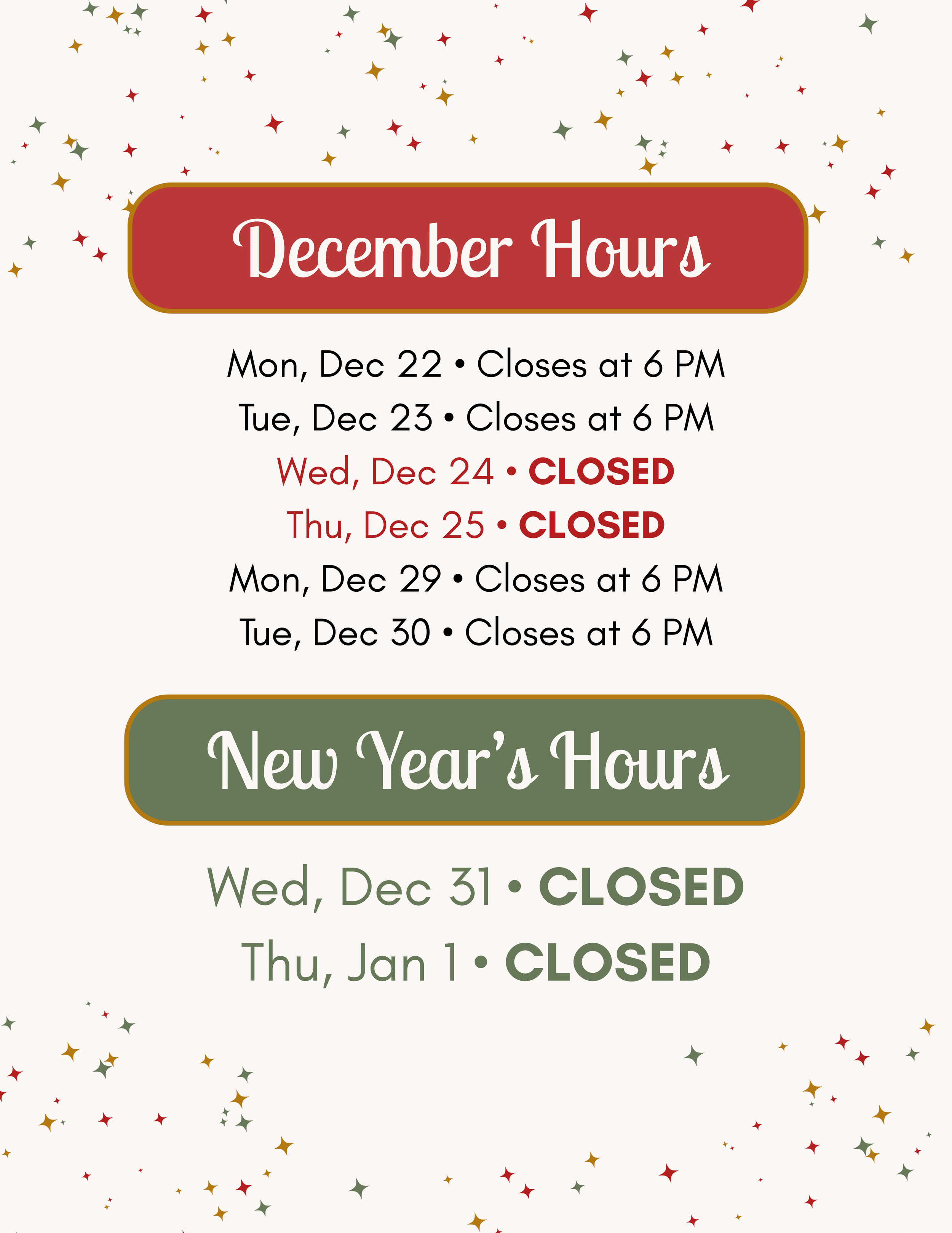 Hours of Operation Monday - Thursday 9AM - 9 PM Friday 9 AM – 6 PM Saturday 10 AM - 6 PMSunday 1 - 5 PM Holiday Hours & Closures